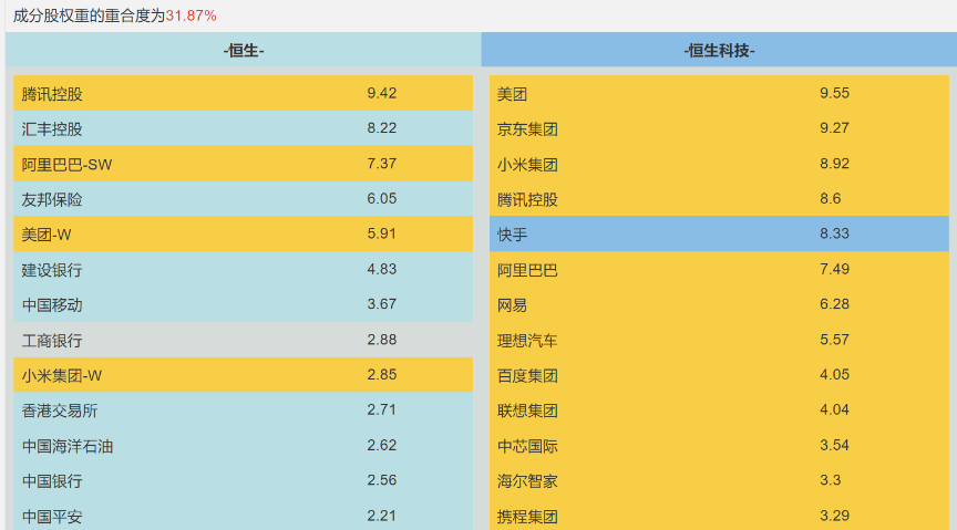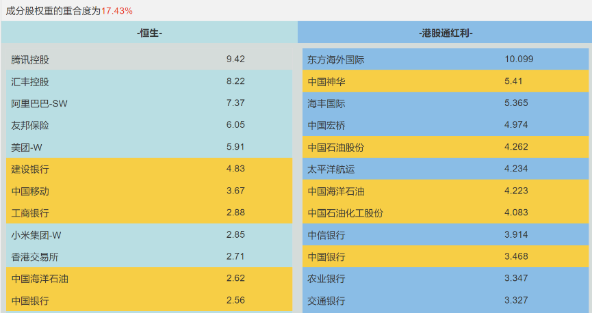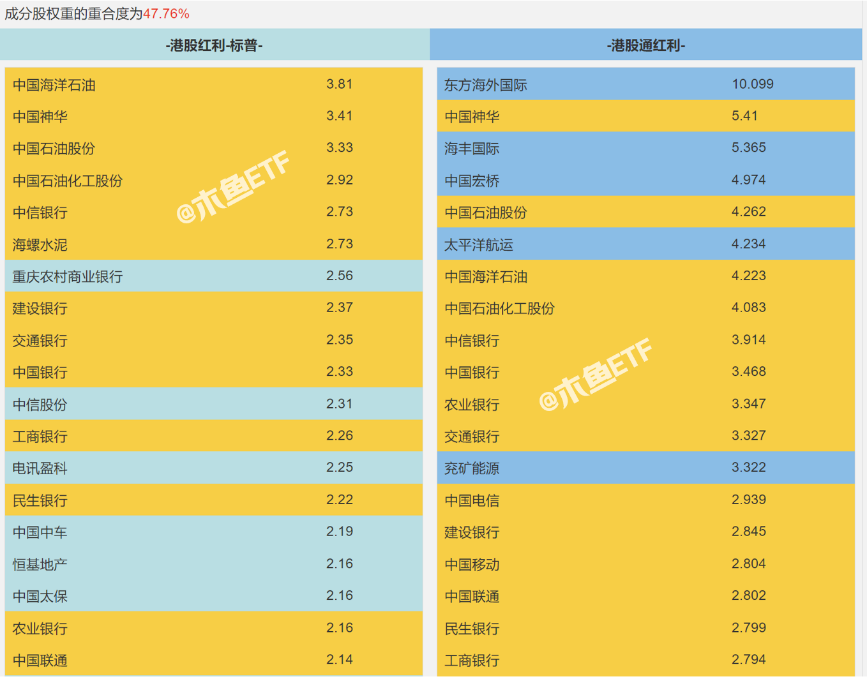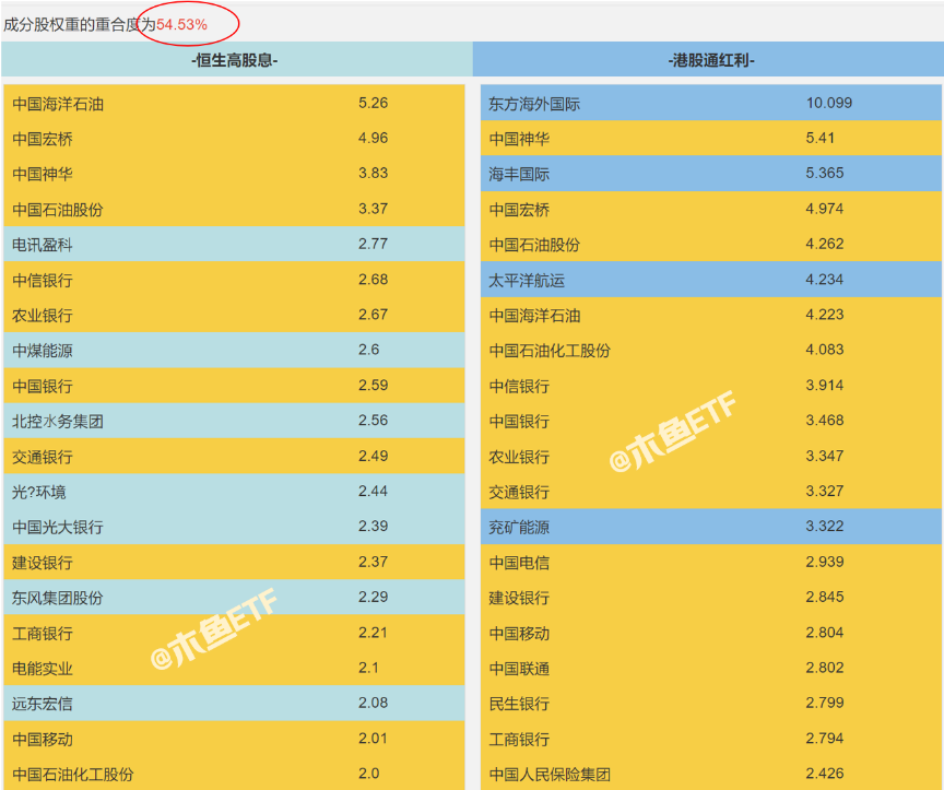 用我们的ETF比较工具一对比,就能找到差异。首先二者的权重股重合度为54.53%,这也就是说表现不会有台大差异。但最大的差异是来自于港股通红利配比了相当多的航运类上市公司。