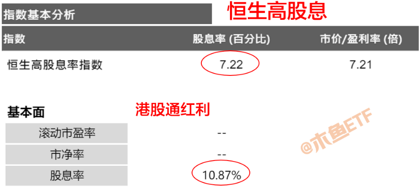 在周五之前,港股红利相关主题ETF,最为稳定、主流的,是恒生高股息ETF和港股通红利(之前叫港股通高股息)ETF,前者是恒生指数公司发的,后者是中证指数公司发的。注意一下,这的股息率,恒生高股息是7.22%,而港股通红利是10.87%,差别比较大?未必,我们继续看。