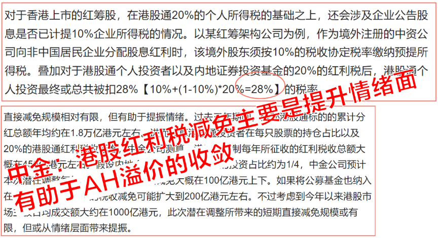 按照中金公司的分析,港股红利税减免的实际意义实际有限,但提升的是机构情绪,也就是炒作情绪。还有一点其实更重要,对于真的要吃红利的长线资金来说,拿着股价更低的H股比同样两地上市的A股更有性价比。