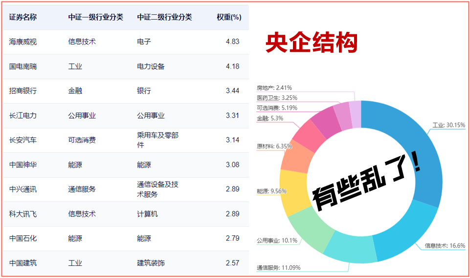 看看它的构成,就知道它包含的行业比较丰富,大小市值都有。但这样以来,中特估属性反而弱了。而且,也找不到它补涨的方向在哪里。