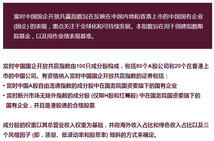 首先,“共赢”系列ETF跟踪的是富时公司开发的“富时中国国企开放共赢指数”,介绍如下。