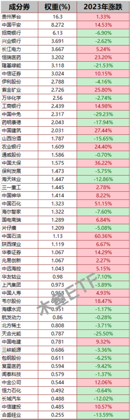 上图是全部五十只成分股的权重比例以及今年表现。“中特估”行情的龙头品种是关注的重点。我们可以看到,虽然中国石油、中国石化两大龙头涨幅惊人,但它们在上证50里的权重小的可怜,分别只有1.1%和1.3%,这还是在大涨之后的权重,年初的权重估计就是0.7、0.8%的水平。