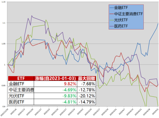 上图是上证50的行业分布,今年以来金融板块有稳健表现,特别是上周银行有惊艳时刻,主要消费则总体低迷,比如酒ETF今年以来是-1.5%的收益,工业方面主要权重是新能源表现拉胯,而原材料和医药也总体表现低迷。