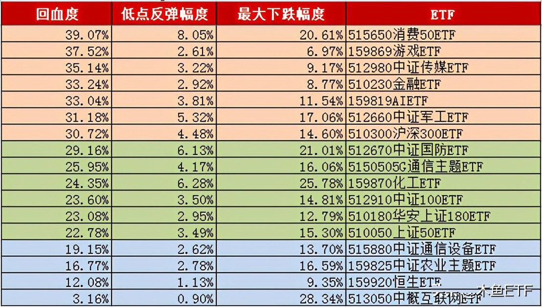 回血度,代表该主题ETF从2月18日市场高点调整后,净值的恢复比例。回血度越高,说明反弹力度越强。像医药等板块,普遍超过节前水平了,但上图的主题显然落后了。
