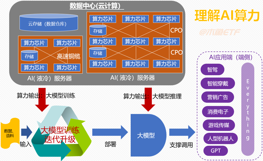 大模型厂商(比如字节、昆仑万维、腾讯)在积累了足够的训练数据后,会利用数据中心提供的算力进行大模型训练迭代升级。
