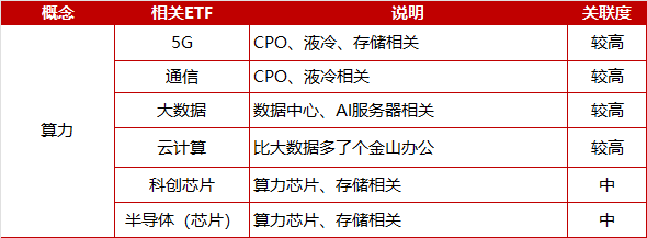 CPO、液冷服务器相关的主要是5G和通信ETF,龙头股股有“易中天”、工业富联、中兴通讯、兆易创新等。