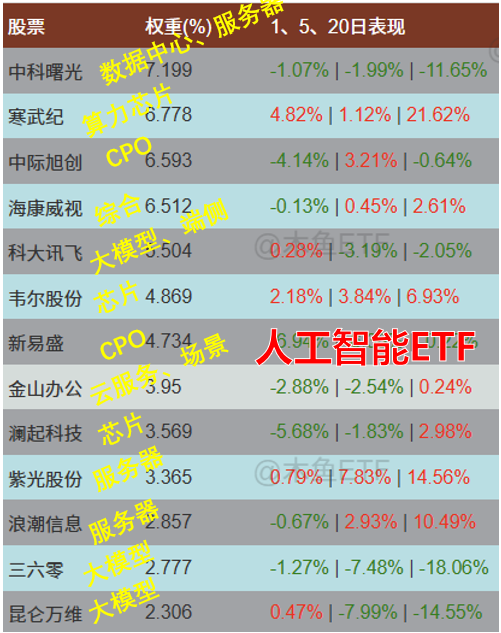 而数据中心、云服务相关的是大数据和云计算ETF,二者差异很小,里面也有做AI服务器的比如中科曙光、紫光股份等。