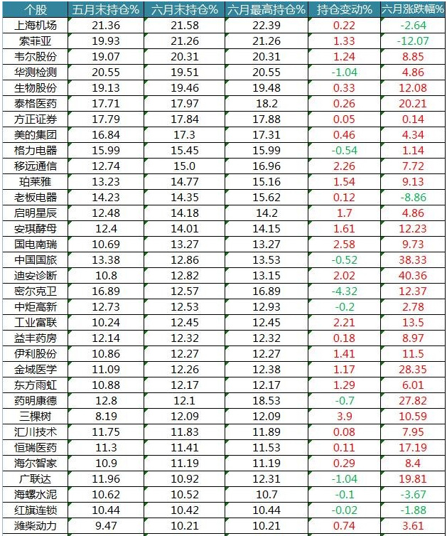 总体而言前20持仓变动幅度并不大,现金流能力突出的上海机场依然是最爱;细分行业龙且运营数据出色的索菲亚排名第2;通过并购实现基本面大幅提升的韦尔位居第3。