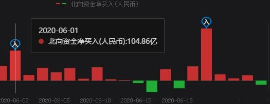 从下图的资金净流入图中可以看出来六月以来北上资金的操作就是三个字,买买买。