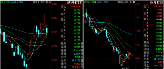 看下软件ETF,本轮涨幅确实强,但是调整幅度同样大。木鱼讲过,软件ETF的成分股平均业绩水平最差,投机炒作成分大,因此是大肉大面的格局,周二调整幅度一度接近4个点。而芯片类ETF肯定是国产替代的主力品种,但其龙头股中机构过多,炒作强度往往跟不上,走势也相对弱。