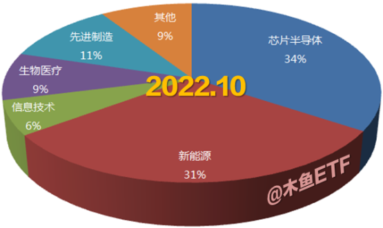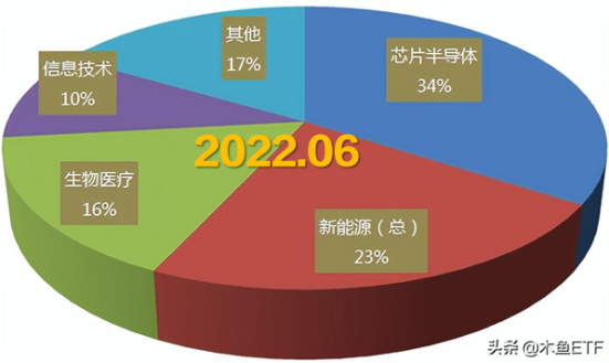 那么到了现在,我们可以发现,新能源比例已经上升到与芯片半导体非常接近的比例了,而生物医药和信息技术占比相对降低,此外,先进制造的比例也显著提升,完全可以拉出来归为一类了。